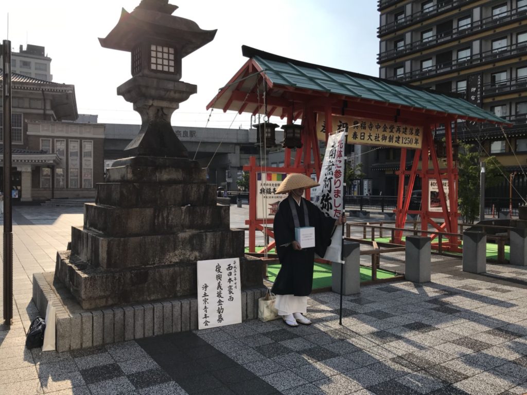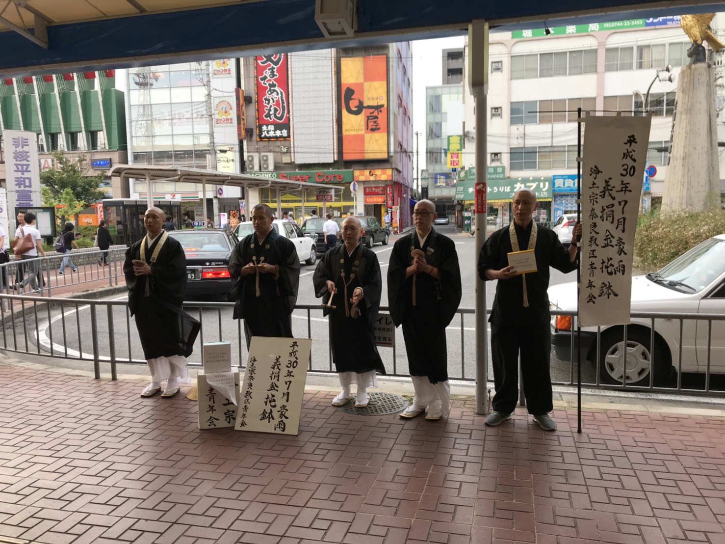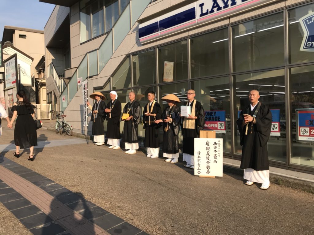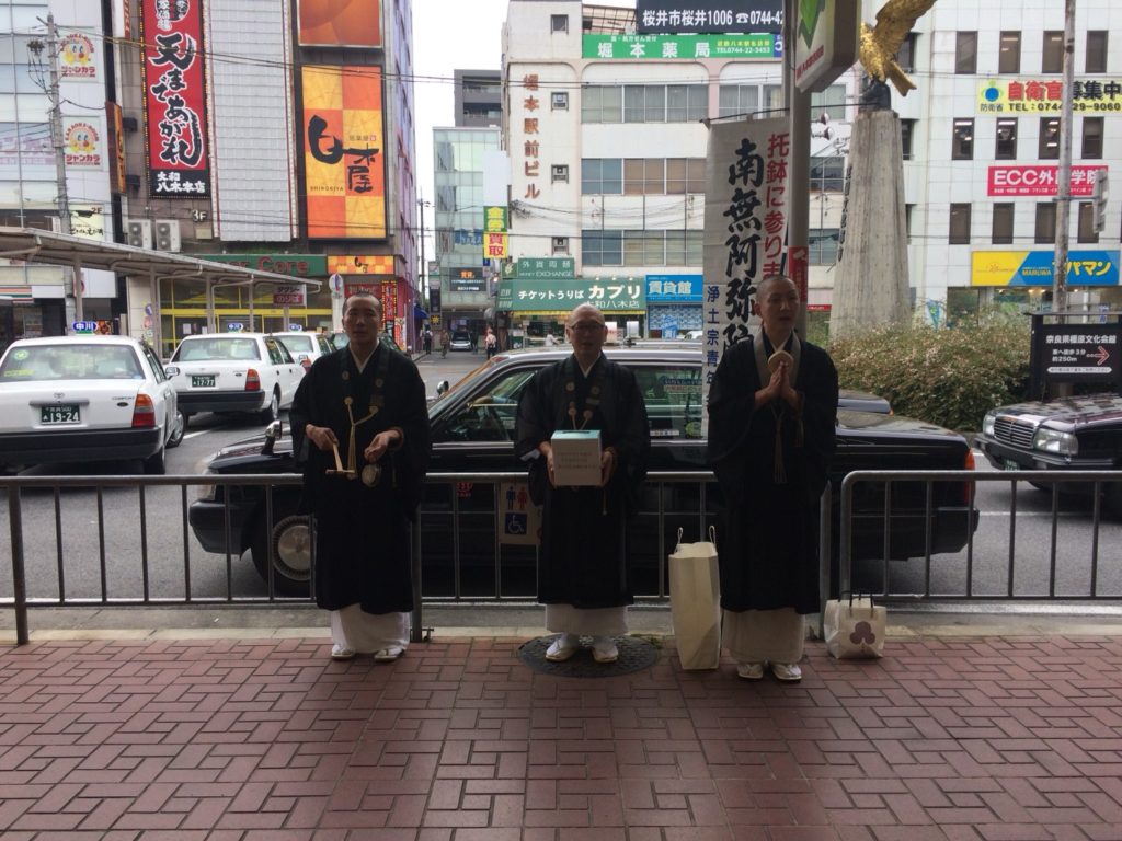 このたびの災害をうけ、浄土宗青年会では奈良県内各地にて義援金を募る托鉢を行いました。